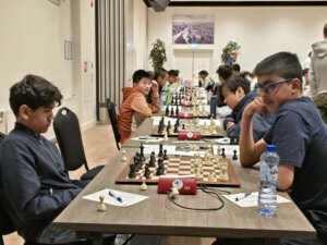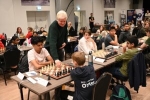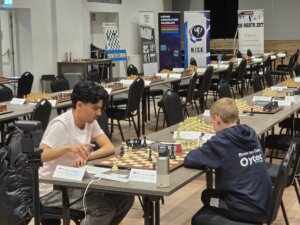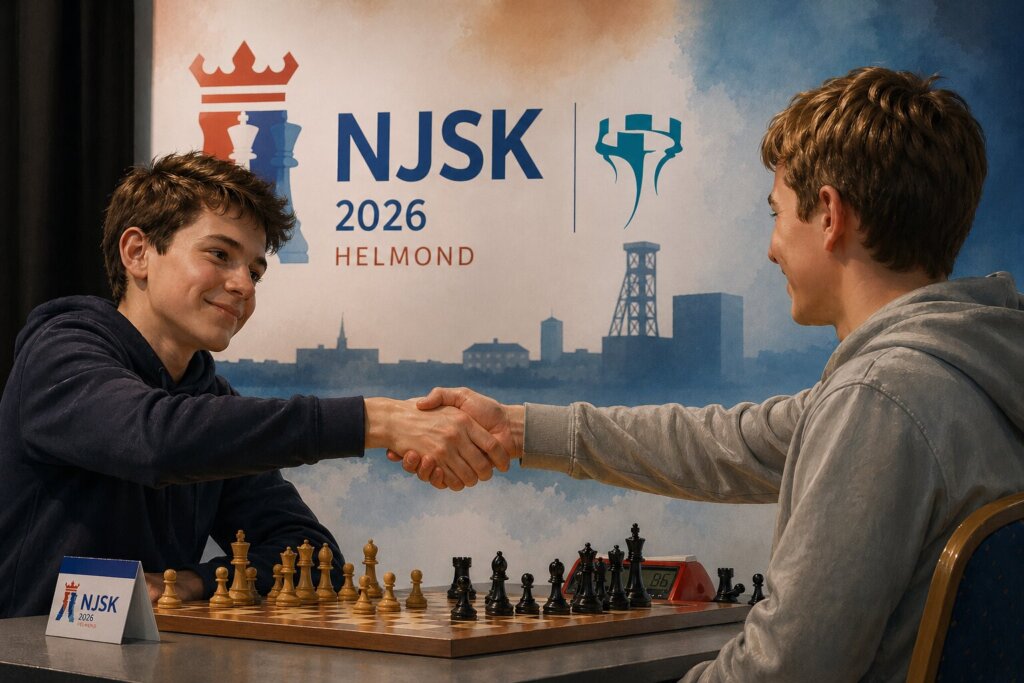 Het NJSK 2026 is begonnen! Na het inspecteren van de speelzaal, het begroeten van goede vrienden en vriendinnen, de kleurloting en de groepsfoto was de start een feit. De eerste zet werd bij Pranav Kshirsagar tegen FM Bram ten Dam verricht door Eric van Breugel van de KNSB. Opmerkelijk was het begin zeker, want na het voltooien van de eerste zet kwamen zowel Bram als Tommy Grooten met de vraag waar de oplossing van de dagelijkse puzzel ingeleverd mocht worden! Als dat geen goed begin is..