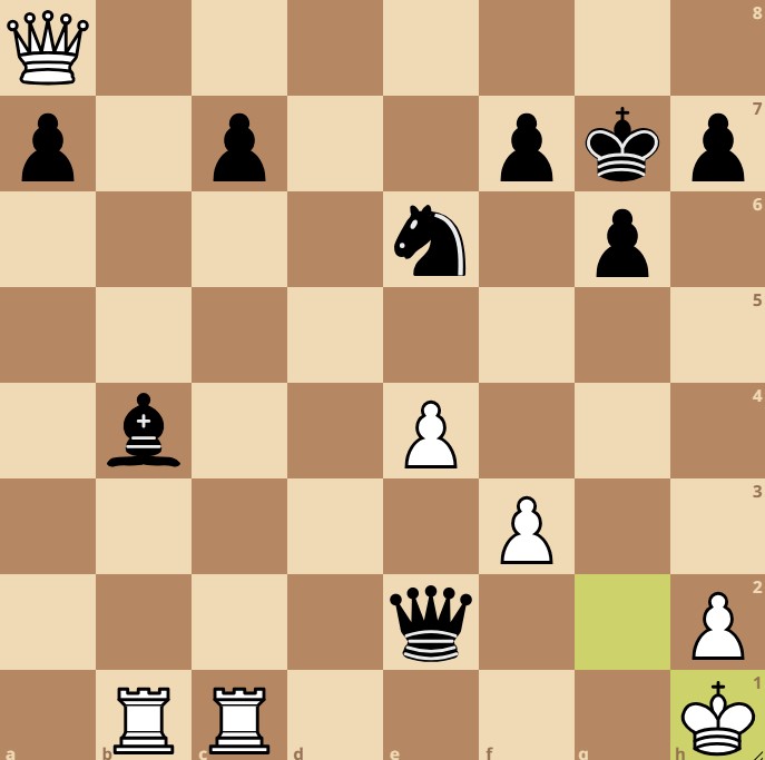 De oplossing van de puzzel: 1…Pf4! Dit moet worden opgevolgd door 2.Df8+ Lxf8 3.Tb2 Dxf3+ 4. Kg1 Ph3#