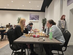Tot slot de C-meisjes. Een partij die hierbij opviel is de partij tussen Emilia-Andreea Panzar en Hannah Urban. Emilia-Andreea kreeg veel mogelijkheid om met haar paarden te dansen en door een aantal mooie offers, zoals 16.Lxa6! wist Emilia-Andreea veel hout te verkrijgen. Niet veel later werd er ook een punt bijgeschreven door Emilia-Andreaa. Op het laatste bord was er nog een verrassende uitslag te melden tussen Keerthi Gnanasekaran en Pomme Leenen. Keerthi offerde wellicht iets te enthousiast een stuk op h6 om zo de koningsstelling bloot te leggen, maar Pomme wist zeer geduldig elke aanval van Keerthi af te wenden. Soms helpt ‘staan’ ook als de beste verdediging, iets wat Pomme deze partij mooi uitvoerde. Een reeks aan aanvallen later won Pomme een stuk extra en kon ze een onhoudbare mataanval opzetten.