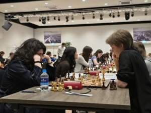 Bij de B-meisjes viel de eerste uitslag van het toernooi. Sarah-Joy Koorevaar wist snel de koningsstelling van Noa Greven open te breken. Sarah-Joy kreeg al vlot een sterk paard op e5, deze mocht blijven staan om vervolgens op c6 in te slaan na de lange rokade van Noa. Hierbij ging er niet alleen hout verloren, maar ontstonden er positioneel ook de nodige problemen voor Noa. Een goed begin voor Sarah-Joy dus! Een andere toppartij was die tussen Eli Alia Jorritsma en Imara Hardeman. Imara leek in het middenspel wel heel graag stukken te willen ruilen en een beter eindspel proberen te bereiken, maar Eli Alia ging hier niet zomaar in mee. Na het ruilen van de dames en het proberen van de nodige tactische trucs, mondde het uit in een gelijk toreneindspel waar geen van beide dames nog resultaat konden bereiken: remise.