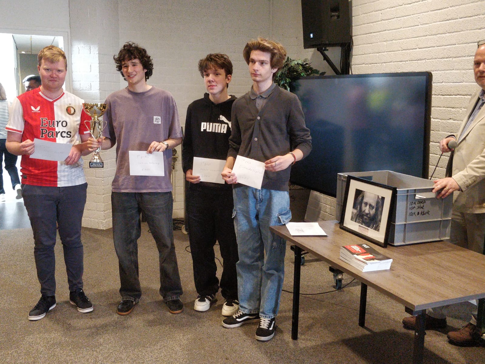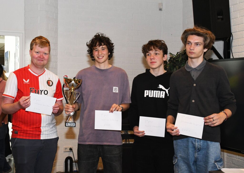 Winnaars JvM 2026: v.l.n.r. GM Thomas Beerdsen (4e), Mees van Batenburg (1e), FM Mykola Korchynskyi en FM Oleksandr Dovgaliuk (gedeeld 2e/3e).